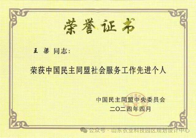 4月18日至19日,民盟中央社会服务工作会议在浙江金华召开。会议对2023年以来在社会服务工作方面做出突出贡献的先进集体和先进个人进行表彰。山东省农业科技园区规划设计工程技术研究中心主任、民盟盟员王梁荣获“民盟中央社会服务工作先进个人”荣誉称号。