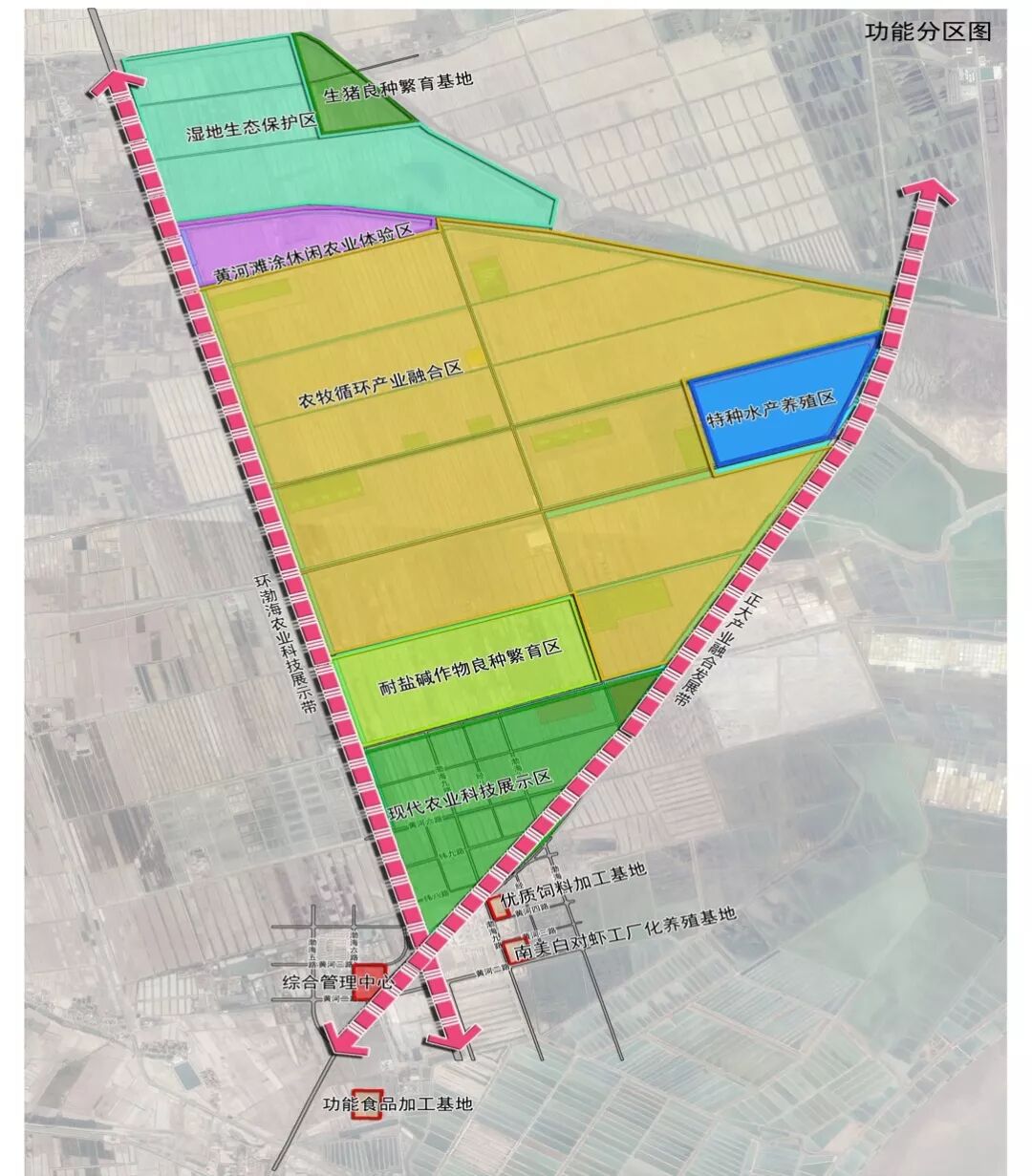 规划将整个产业园布局为“一心、两带、六区、四基地”,即:综合管理中心、正大产业融合发展带、环渤海农业科技展示带、现代农业科技展示区、渔业休闲体验区、耐盐碱作物良种繁育区、农牧循环产业融合区、黄河滩涂休闲农业体验区、湿地生态保护区、现代食品加工基地、优质饲料加工基地、南美白对虾工厂化养殖基地和种源基地。